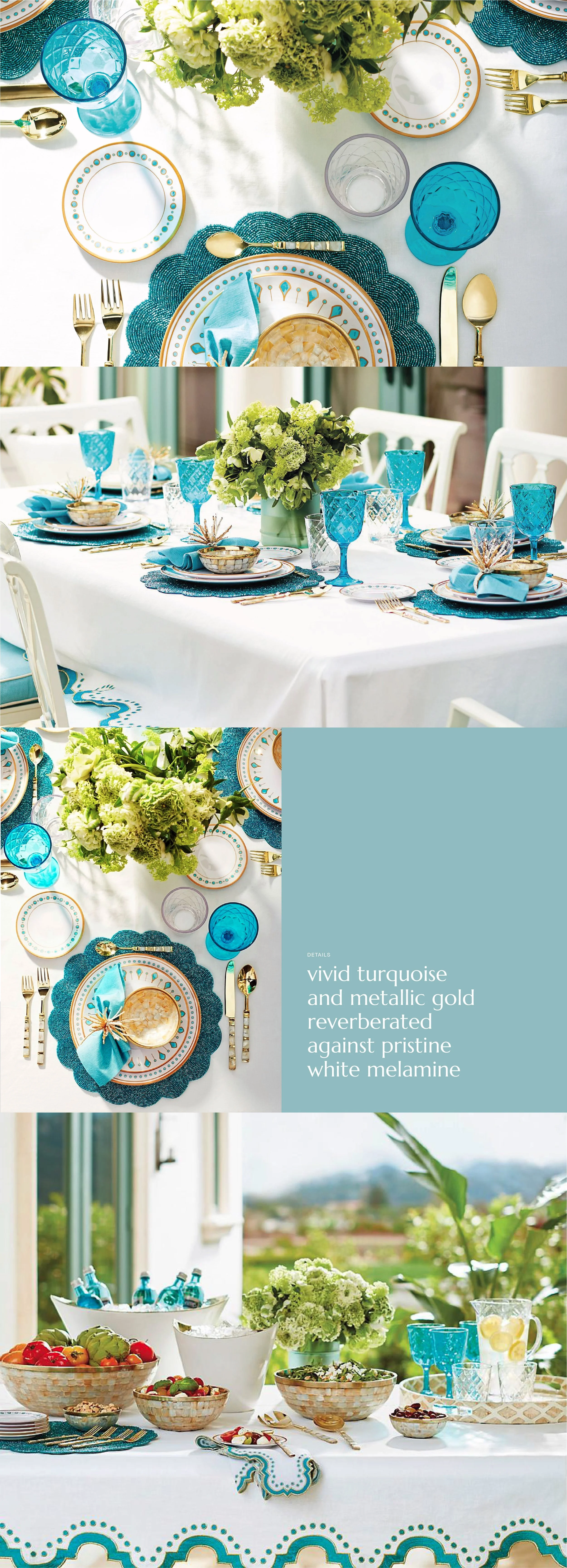 Working with Frontgate I had the opportunity to design a dinnerware collection for celebrity chef Donatella Arpaia’s culinary line. This collection displays a unique graphic design of vivid turquoise and metallic gold reverberated against pristine white melamine dinnerware.