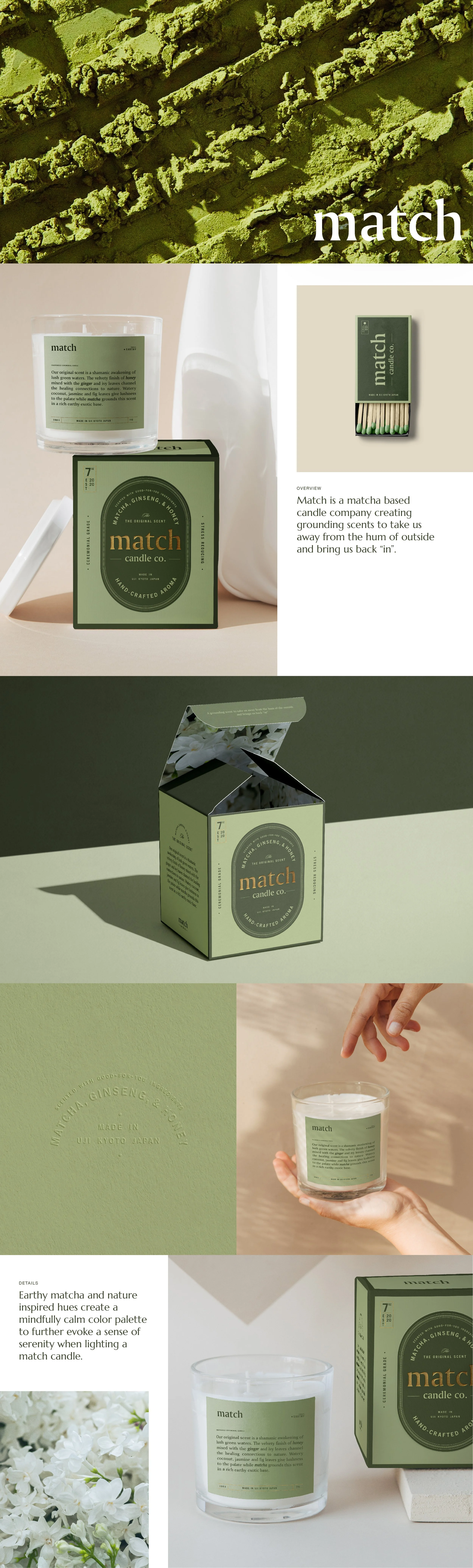 Crafted from traditional Japanese matcha tea rituals, Match was born with a passion to infuse calming ingredients within a ceremonial candle. With matcha as the rich earthy base, the brand identity captures the key ingredient story while also symbolizing the striking of a match. The brand features a mindfully calm color palette to further evokes a sense of serenity, along with crafted graphic details to build a cohesive and compelling brand story.